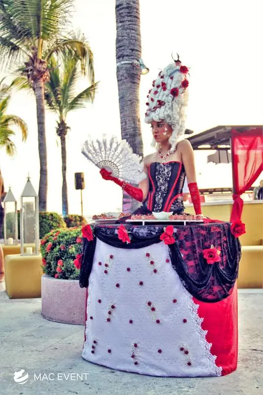 The strolling tables add creativity and elegance to weddings, parties, and corporate events in Mismaloya. Performed by entertainers wearing beautifully designed costumes with built-in tables, this event entertainment rental offers a unique way to serve drinks, appetizers, or favors. The strolling tables move gracefully among guests, combining functionality with visual impact and interactive charm. Renting strolling tables in Mismaloya ensures professional performers, stunning presentation, and seamless coordination with your event theme. For a stylish and unforgettable experience that delights guests, the strolling tables are a perfect addition to any celebration.